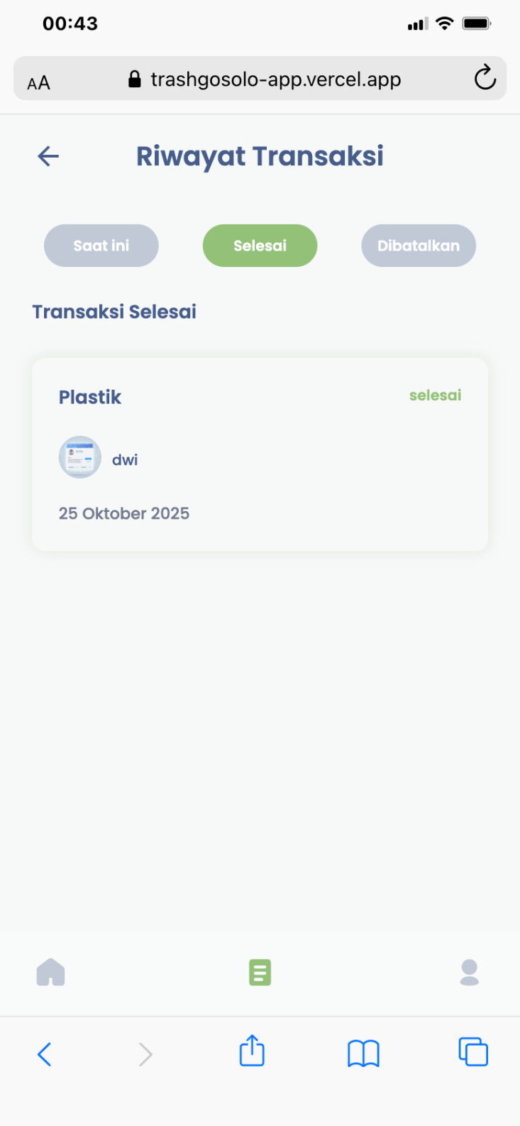 Berikan penilaian dan ulasan pengepul, lalu klik selesaikan transaksi, jika berhasil akan menampilkan pesan berhasil dan akan diarahkan kembali ke halaman home
