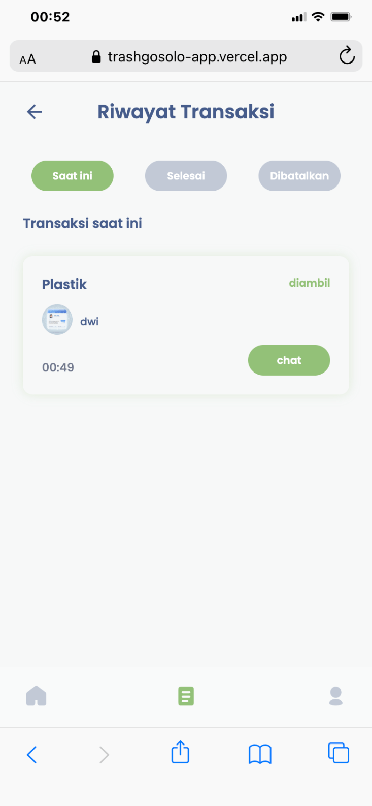 Pilih Transaksi yang telah diambil pengepul , anda dapat melihat riwayat transaksi aktif atau pada halaman beranda